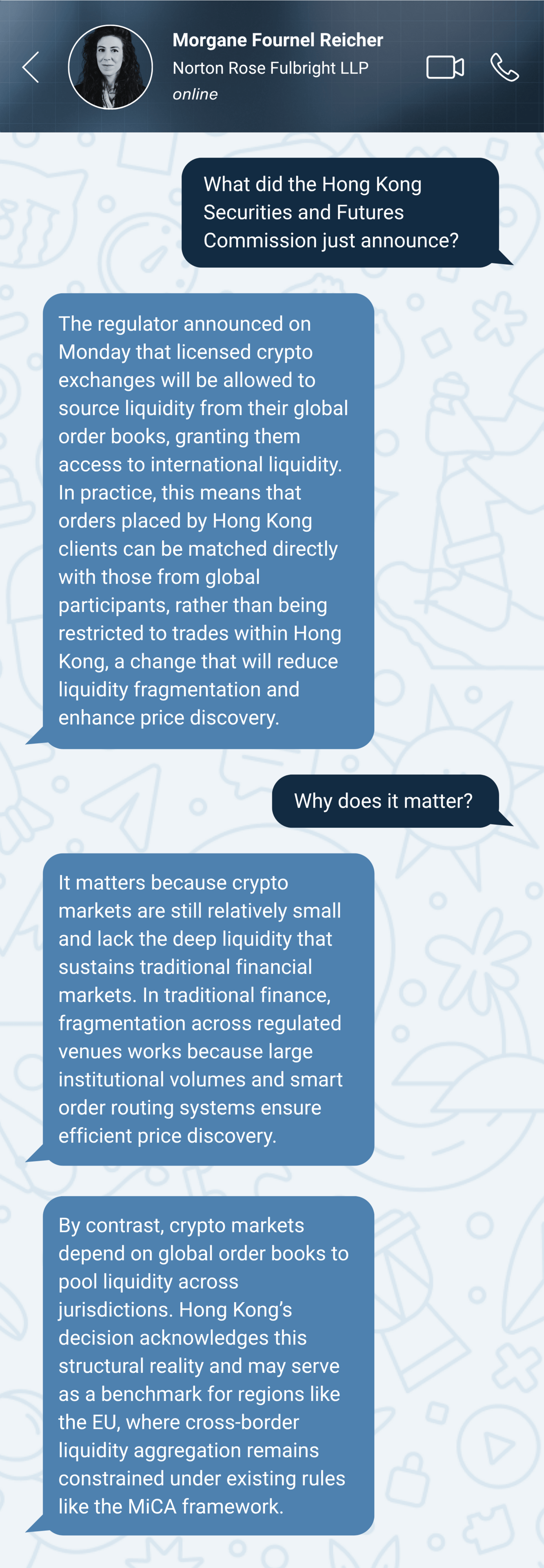 A conversation with Morgane Fournel Reicher, lawyer at Norton Rose Fulbright LLP. With her, we discussed the Hong Kong regulator’s decision to allow licensed crypto exchanges to source liquidity from their global order books, and why it matters.