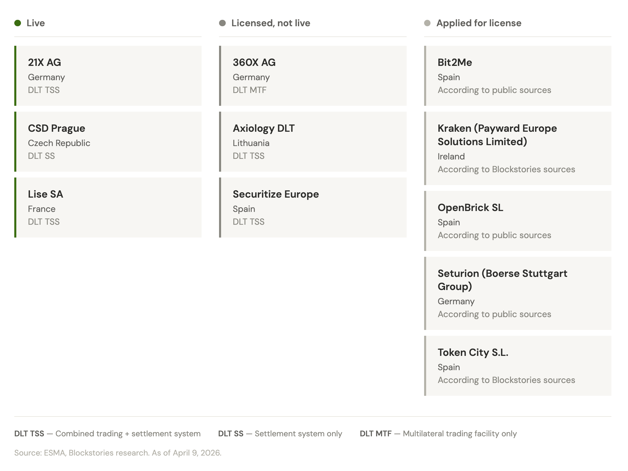 Overview of all operators that are live, licensed, or have applied under the EU DLT Pilot Regime.